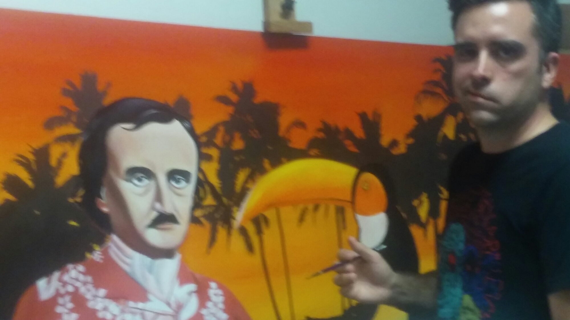 Here’s an artist painting a tropical Poe scene, quothe the toucan, nevermore!